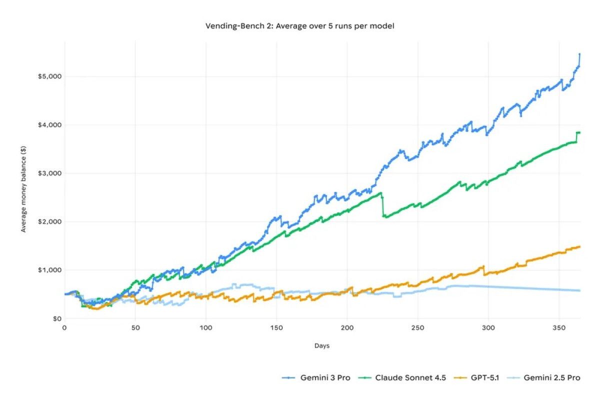 Gemini 3 Pro, simüle edilmiş bir yıllık çalışma süresince tutarlı araç kullanımı ve karar alma süreçleri sergileyerek görevden sapmadan daha yüksek getiri elde edilmesini sağlıyor.