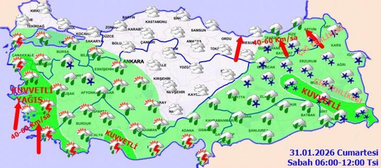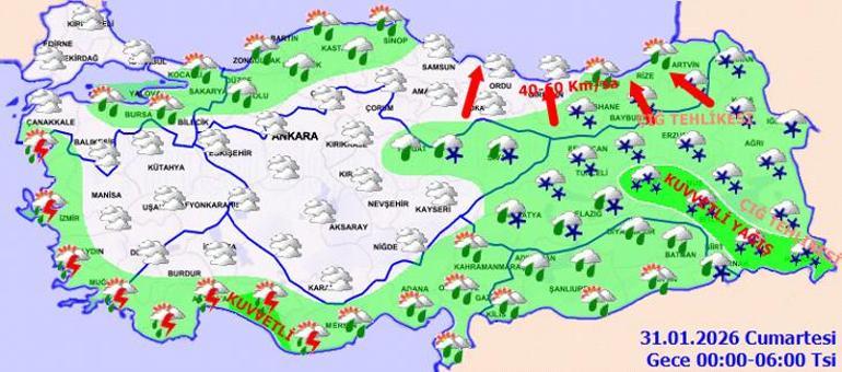- KUVVETLİ YAĞIŞ UYARISI: Kıyı Ege, Batı ve Doğu Akdeniz, Doğu Anadolu’nun güneyi, Çanakkale, Tekirdağ ve Osmaniye çevreleri için kuvvetli yağış ihtimali bulunmaktadır. Buzlanma, don, ve çığ riski gibi olumsuzluklara karşı dikkatli olunması önerilmektedir.